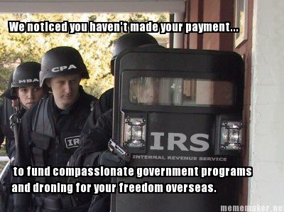 and sustain a fiendish, Orwellian-style government that is about to overwhelm and crush us and all things noble.